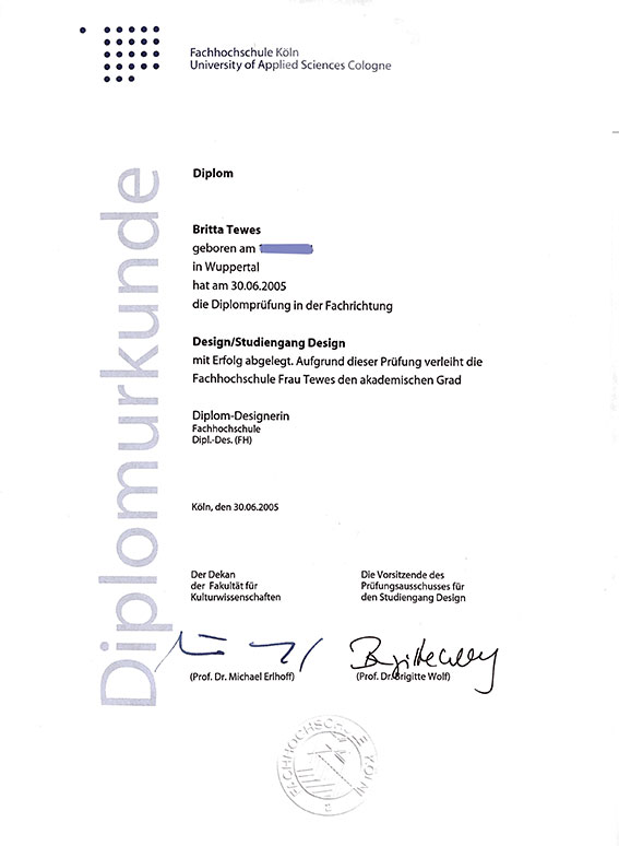 Designstudium an der Köln International School of Design (Fachhochschule Köln) von 1999-2005.